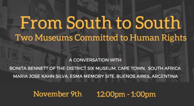 (Miércoles 9 de Noviembre): El Instituto para el Estudio de los Derechos Humanos de Columbia University organiza una charla sobre el compromiso de los museos en la defensa de los derechos humanos. Participarán Bonita Bennett del Museo de Ciudad del Cabo, Suráfrica y Maria Jose Kahn Silva del Esma (Espacio Memoria y Derechos Humanos) de Buenos Aires, Argentina.