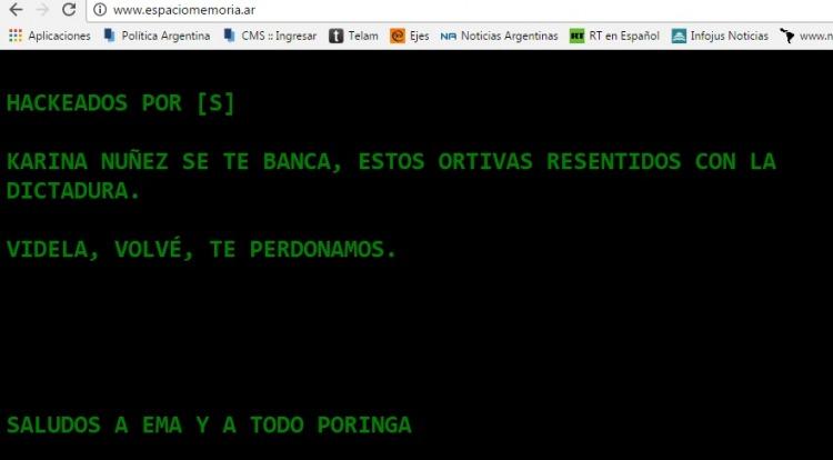 Tras lo sucedido, hackearon la web de Espacio para la Memoria y dejaron un aterrador mensaje. «Karina Nuñez se te banca, estos ortivas resentidos con la dictadura», aparece escrito en la home de la página como respaldo a la funcionaria despedida. Además, escribieron: «Videla, volvé, te perdonamos», hacienod recordar a las épocas más oscuras de nuestro país.