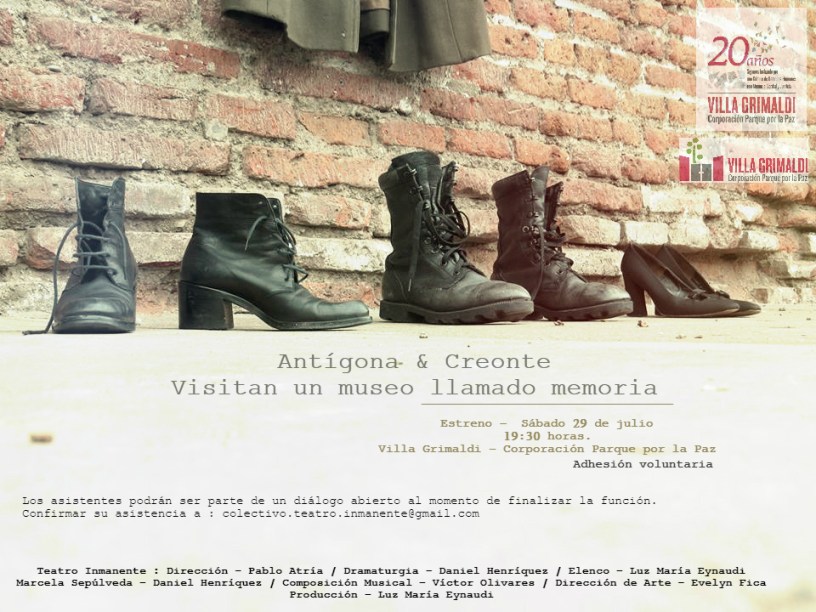 El sábado 29 de julio a las 19:30 hrs se realizará el estreno de la obra Antígona y Creonte visitan un museo llamado memoria, de la compañía Teatro Inmanente. La función se presentará en Villa Grimaldi, bajo el marco de la conmemoración de los 20 años de apertura- a público-del Parque villa por la Paz.