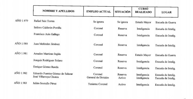 En el marco de aquel procedimiento judicial, Garzón recibió un listado de militares españoles que habían realizado cursos en Argentina durante los años de la dictadura. El documento había sido enviado el 19 de enero de 1998 por el Mando de Adiestramiento y Doctrina del Ejército, que había localizado en sus registros los casos de 10 militares que entre 1979 y 1983 se desplazaron a Buenos Aires. Según consta en esa nómina, la mayoría eran coroneles y habían realizado cursos en la Escuela de Inteligencia del régimen argentino.
